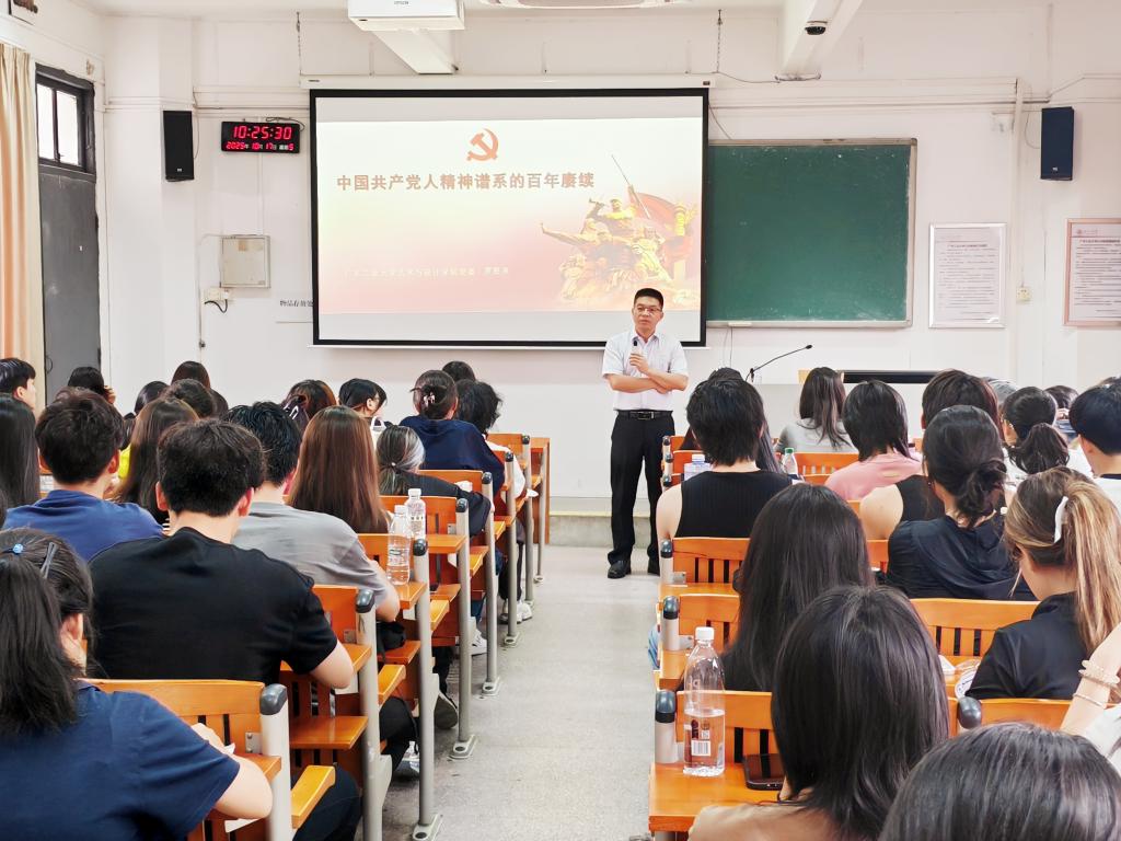 课程围绕百年党史、时代方位、精神谱系与时代担当层层展开,为新生开启大学生涯提供了坚实的思想引领。罗胜京以党史为脉络,带领同学们回顾党的百年奋斗历程,指出“党的历史是最生动、最有说服力的教科书”。他结合党的二十大精神,系统阐释新时代十年的三件大事与标志性成果,明确我们所处的历史方位与使命任务。通过讲述长征等感人至深的红色故事,他生动解读了中国共产党人精神谱系的深刻内涵与时代价值,并紧密联系学校发展,强调广工作为“省属理工科高校‘长子’”的责任担当,激励同学们将艺术设计与国家发展相结合,努力成长为高层次设计创新领军人才。